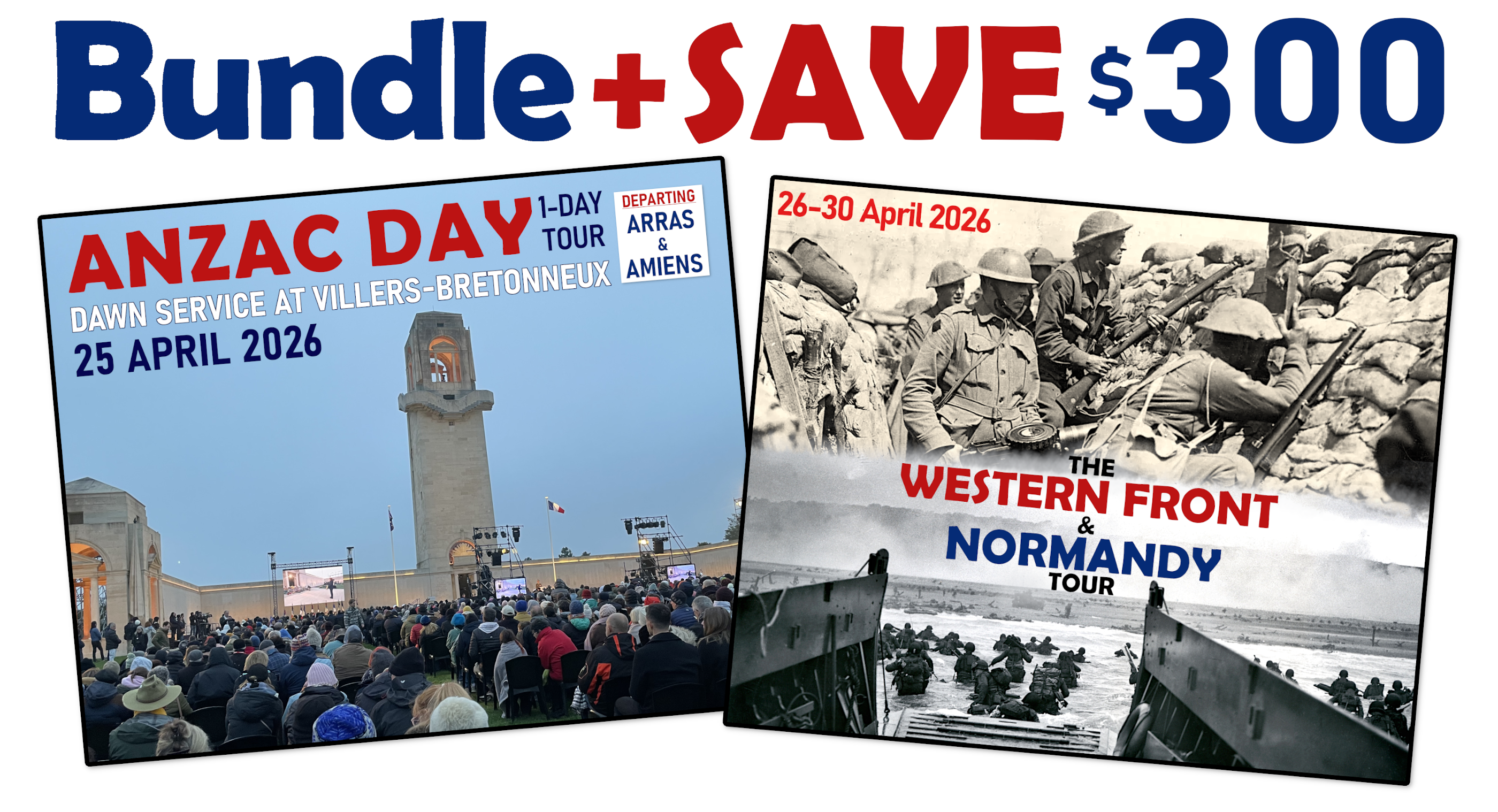 Enhance your European travel experience when you combine our Anzac Day 'Dawn Service' tour at Villers-Bretonneux with our exclusive 5-Day Western Front & Normandy tour (26-30 April 2026). See it all and SAVE $300 per person.